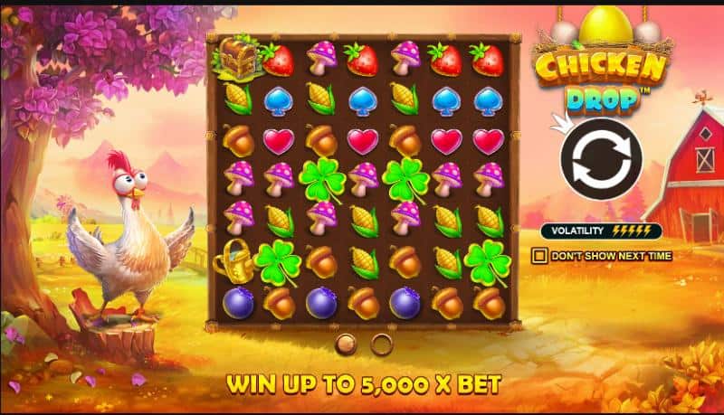 Begitu memulai permainan, visualnya langsung memikat. Latar belakang menampilkan ladang hijau dengan ayam-ayam lucu berlari-lari, telur berwarna-warni, dan efek animasi yang menggemaskan. Simbol-simbol utama, seperti ayam jago, ayam betina, dan telur emas hadir dengan animasi halus yang membuat permainan terasa hidup. Ditambah efek suara “cluck cluck” dan musik ceria, setiap putaran menjadi pengalaman yang menyenangkan dan menghibur.
